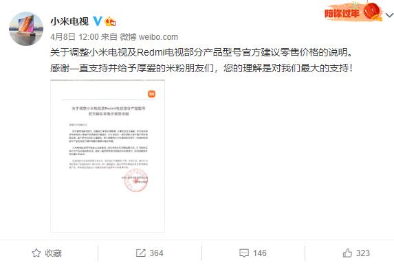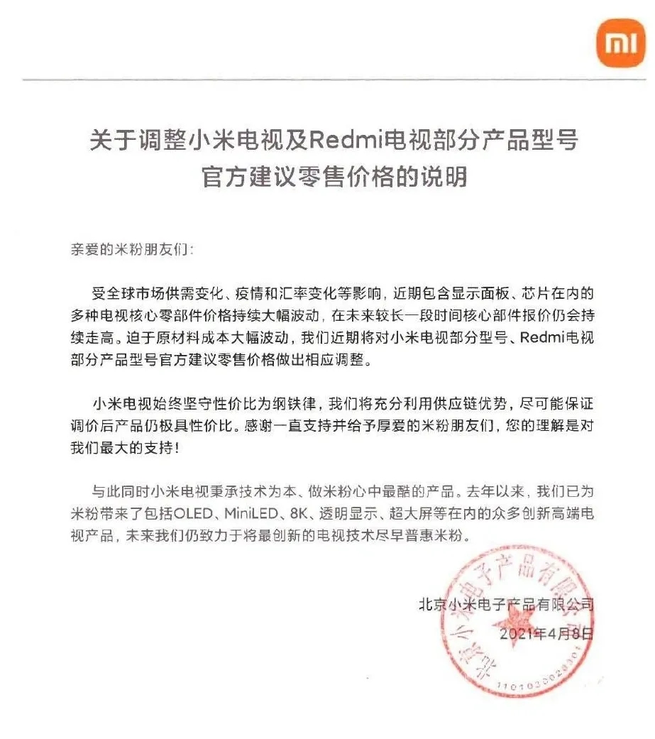 4月8号,小米电视官方微博发文宣称,由于迫于原材料成本大幅波动,小米近期将对小米电视部分型号、Redmi电视部分产品型号官方建议零售价格做出相应调整。