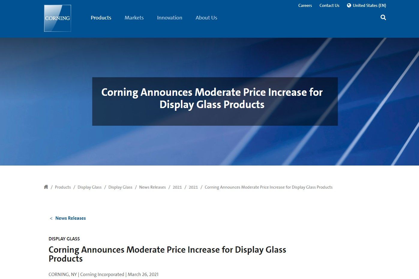 除了芯片涨,康宁近日在官网发布公告称,将在今年第二季度适度上调显示屏玻璃基板的价格。康宁在其发布的公告里指出,此次价格的调整主要受玻璃基板供应短缺,以及物流、能源、原材料涨价和其他运营支出成本增加的影响。同时,自2020年以来,受到疫情等多方因素的影响,过去维持玻璃基板制造所需的贵金属成本已经大幅上升。