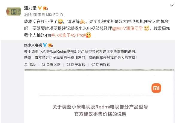 紧接着,小米产业投资部合伙人潘九堂也转发了该微博,并说道:“成本实在扛不住了,请谅解。要买电视尤其是超大屏电视抓住今天的机会吧!”