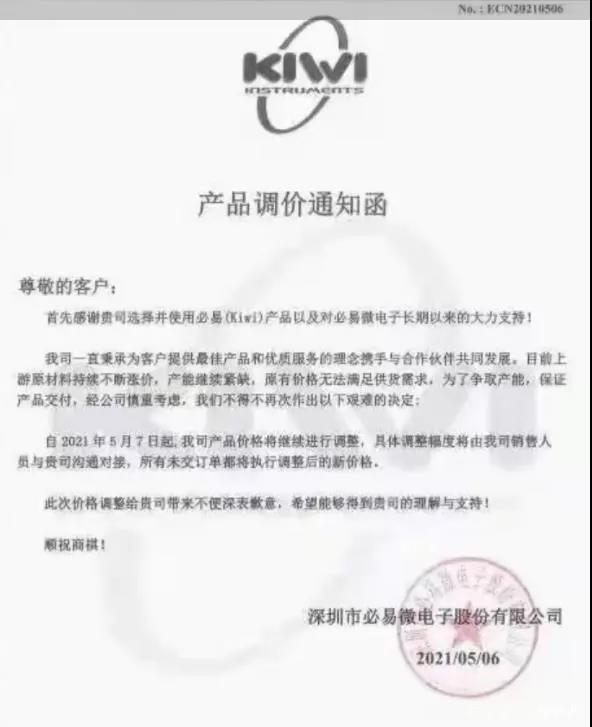 2021年5月6日,电源芯片设计企业必易微向客户发布产品调价通知函,称由于上游原材料持续涨价,产能继续紧缺,原有价格无法满足供货需求,决定自2021年5月7日起,产品价格将继续进行调整。