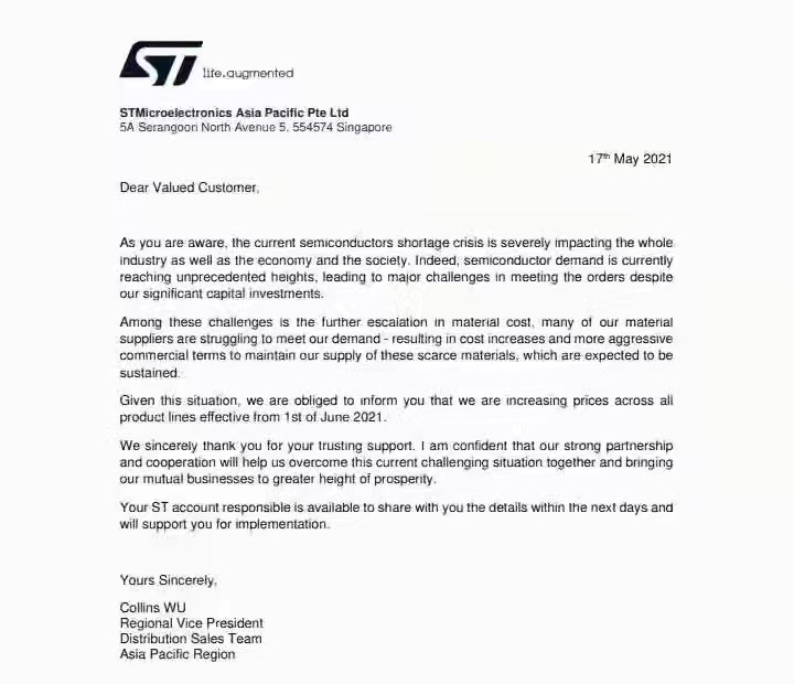 通俗来讲,就是由于原材料端价格暴涨,加上半导体短缺危机,导致供应成本增加,基于此,意法半导体(STM)宣布将从2021年6月1日起提高所有产品线的价格。