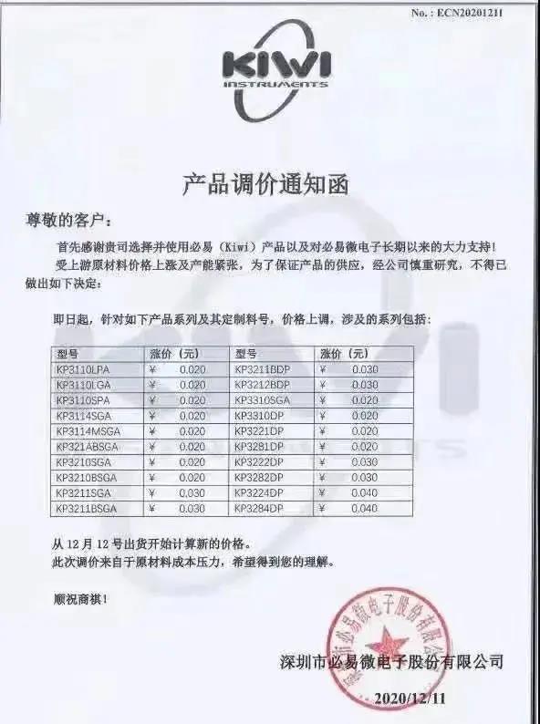 △2020年12月,必易微电子产品调价通知函