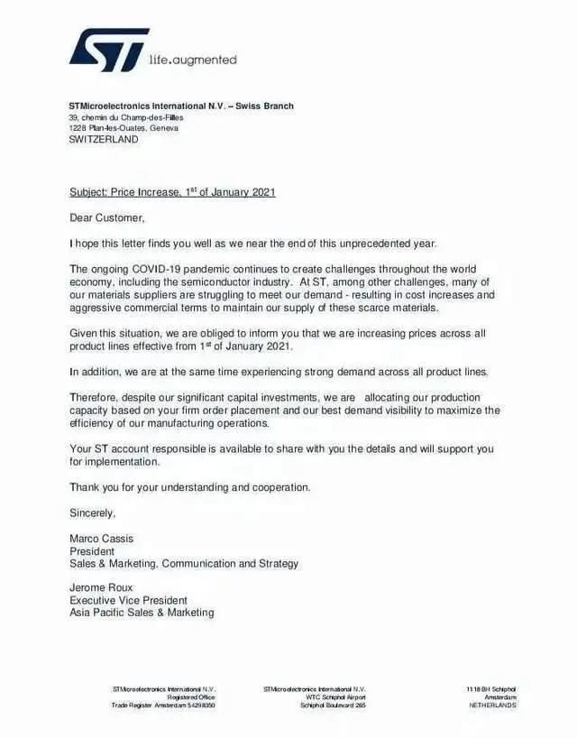 在此之前,2020年12月,受疫情影响,全球经济下行的前提下,由于原材料大涨,为了维持供应商对其原材料的稳定供应,意法半导体(STM)就发布过涨价告知函,以此释放承担的巨大成本压力。