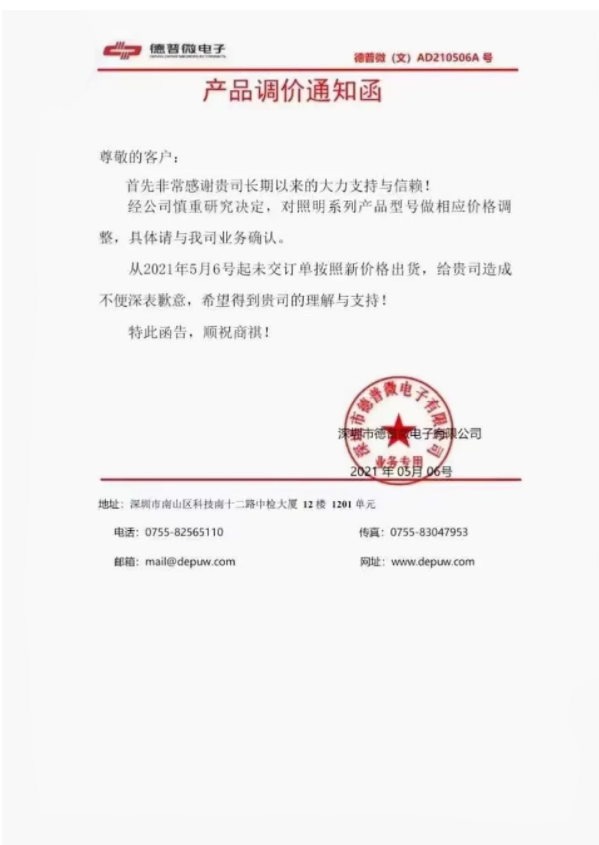 2021年5月6日,深圳市德普微电子有限公司发布涨价函,宣布自5月6日起对照明系列产品型号做相应价格调整,未交订单按照最新价格出货。