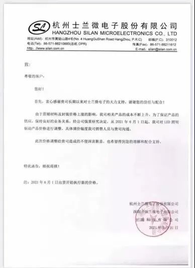 2021年5月31日,杭州士兰微电子股份有限公司向客户下发涨价通知函表示,从6月1日起,对LED照明驱动产品价格进行调整,具体调价幅度由公司销售人员进行沟通。