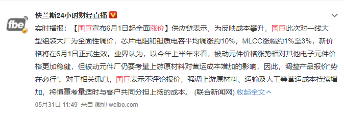 对于上述信息,国巨表示不予评论,该公司强调,上游原材料、运输及人工等营运成本持续增加,公司将慎重考量适时与客户共同分担上扬的成本。