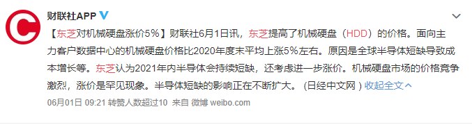 据日媒报道,东芝近日提高了HDD的价格,面向主力客户数据中心的HDD价格比2020年度末平均上涨约5%,主要原因是全球芯片缺货导致HDD成本提升,同时数据中心市场对HDD硬盘的需求还很高。