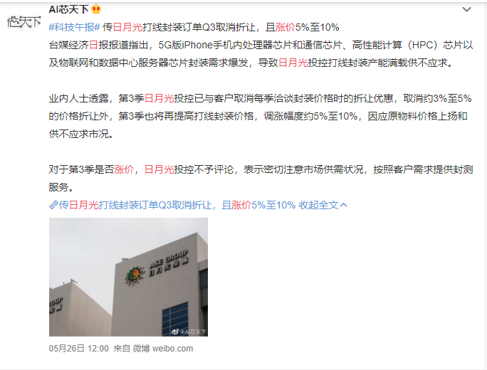 据该公司法人透露,第三季日月光投控已与客户取消每季洽谈封装价格时的折让优惠,取消约3%至5%的价格折让外,第三季也将再提高打线封装价格,调涨幅度约5%至10%,原因主要是原材料价格上扬以及市场供应不足等。