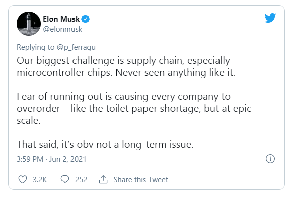 本周三,特斯拉CEO马斯克在社交平台上表示:“目前最大的挑战是供应链,尤其是微控制器芯片。从没出现过这样的情况,”这从中说明了芯片短缺已经对特斯拉的生产造成影响。