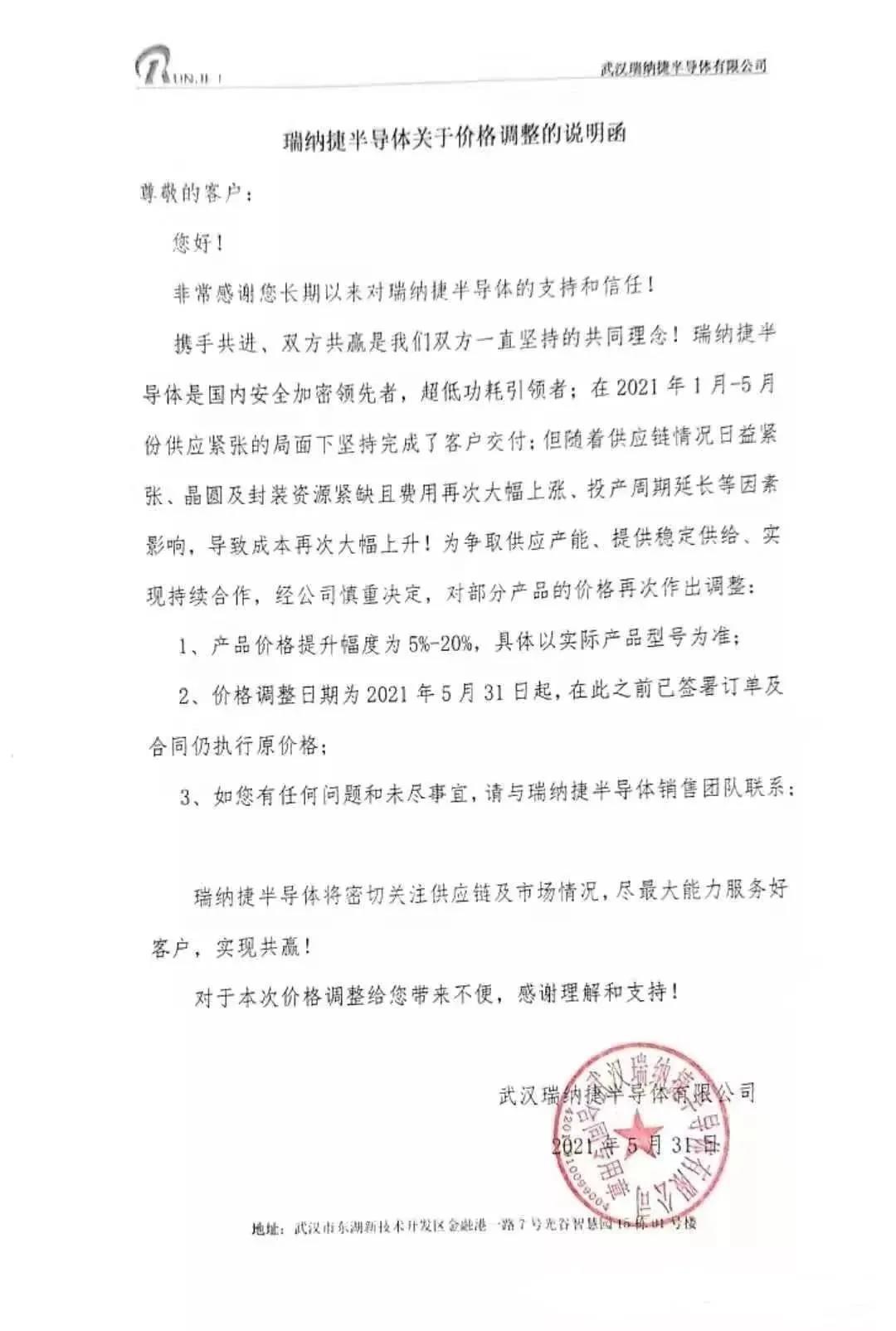 值得注意的是,4月7日,武汉瑞纳捷半导体有限公司就发过一次涨价函,宣布产品价格提升幅度为5%-20%。价格调整日期为2021年4月8日起,在此之前已签署订单及合同仍执行原价格。