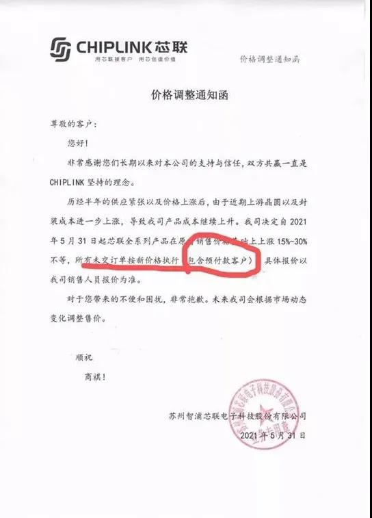 2021年5月31日,智浦芯联发布价格调整通知函。智浦芯联表示,历经半年的供应紧张以及价格上涨后,由于近期上游晶圆以及封装成本进一步上涨,导致我司产品成本继续上升。我司决定自2021年5月31日起,芯联全系列产品在原有销售价格基础上上涨15%-30%不等,所有未交订单按新价格执行(包含预付款客户),具体报价以我司销售人员报价为准。