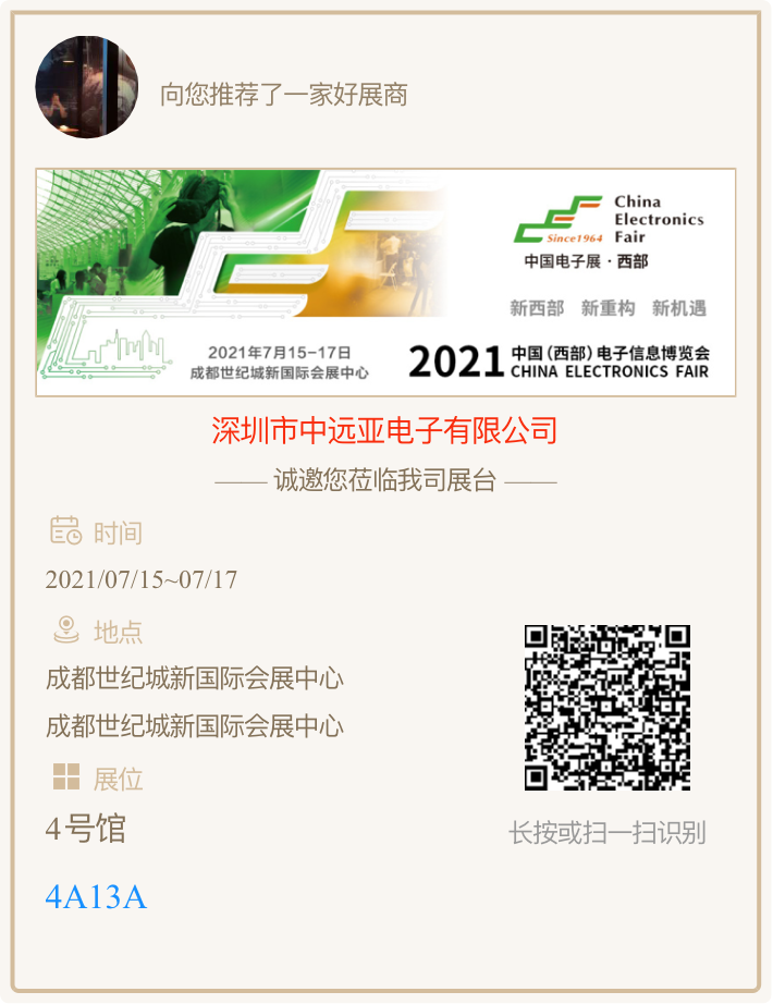 2021年中国(西部)电子信息博览会将于7月15-17日盛大开幕!以“新西部 新重构 新机遇”为主题三大展馆同时联动集中展示十大电子产业核心内容致力打造西部最大全国领先的电子信息领域展示平台在此,中远亚电子在4号馆4A13A展位诚挚地欢迎您莅临展位参观指导随着西部大开发和科技兴国战略的实施,四川省作为西南大省,正加速构建包括电子信息产业在内的“5+1”现代产业体系,致力于打造万亿级电子信息产业集群。2020年,四川省电子信息产业实现主营业务收入达1.2万亿元,居中西部地区第一,成都作为中国电子信息产业核心城市、中国软件名城、国家新一代人工智能创新发展试验区,也为新型城市发展提供新的发展模式和机遇。以5G和大数据、智能制造、智能终端、基础电子、集成电路、工业互联网为支撑的电子信息产业正在促进四川经济发展以及整个西部地区的快速发展。电子信息产业与传统的产业相比,正在从国际向国内转移,从东部向西部转移,四川省高度重视电子信息产业发展,积极培育集成电路与新型显示、新一代网络技术、大数据、软件与信息服务等4大重点领域,聚力推动电子信息产业基础高级化、产业链现代化,全力打造具有全球竞争力的世界级电子信息产业集群。成都市作为西部地区的中心城市,具有充足的人力资本和良好的教育资源,具备制造业全产业体系,拥有高新制造业产业升级所需的工业基础。基于西部如此利好环境,2021中国(西部)电子信息博览会将于2021年7月15日至17日在成都世纪城新国际会展中心举办。本届以“新西部 新重构 新机遇”为主题基础电子馆科技创新与信息技术馆西部数字新场景馆 4号馆—基础电子馆 助力产业基础高级化电子元器件展区、集成电路展区、微波射频展区、测试测量展区 3号馆—科技创新与信息技术馆 加快推进新一代信息技术、新型显示展区、智能制造和工业互联网展区、5G和智能终端展区、智能驾驶展区、网络安全展区 2号馆—西部数字新场景馆 促进新经济、呈现新场景大数据和人工智能展区、智慧生活展区为业界充分展示智能时代电子信息产业最新发展成果与趋势打造西部最大全国领先的电子信息领域展示平台集中展示包括智能驾驶、5G和智能终端大数据存储和人工智能、新型显示集成电路、电子元器件测试测量与微波射频、网络安全等代表电子信息产业未来发展的核心内容同期将举办“1+2+N”等多场活动“1+2+N”即——“1”场开幕峰会2021年中国(西部)电子信息博览会开幕式暨成渝双城经济圈电子信息产业峰会“2”场竞技赛事“快克杯”全国高技能焊接装配大赛2021年中国(西部)电子信息博览会电竞大赛“N”场专业论坛成德眉资电子信息产业一体化发展论坛汽车电子发展论坛核心电子元器件发展论坛IC设计与创新应用论坛5G+AI+IoT融合应用论坛中国大数据存储高峰论坛2021中国(西部)网络安全高峰论坛半导体国产化替代高峰论坛军民两用电子信息发展论坛微波射频技术论坛具体活动时间安排如下⬇⬇⬇2021年7月15日-17日中远亚电子与您相约成都4号馆4A13A号展位我们不见不散~▼观众扫码预登记▼【温馨提示】按照国家防疫政策要求,请实名登记并携带身份证、健康绿码和防疫行程卡到场,专业贸易展会限18岁以上人士参观。深圳市中远亚电子有限公司累积十年的电子元件供应经验每颗物料可精准定位上游的仓储渠道缩短供应链节约成本操作流程精准去市场化操作大范围地避免炒高芯片价格通过按量按价的采购真正为客户做到节约成本采购芯片,手机联系13723757551,QQ/微信:799929715或者扫描下方二维码直接进入小程序询价购买。