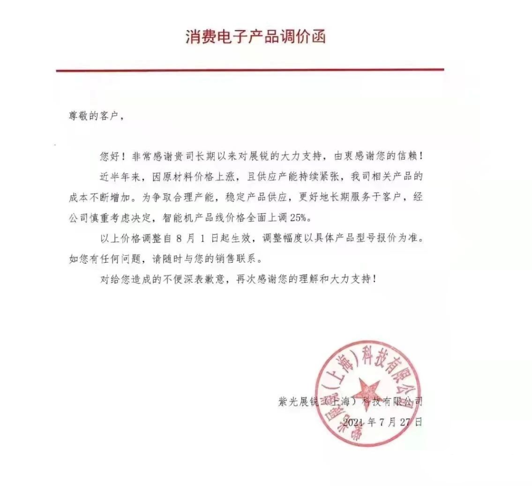 您好!非常感谢贵司长期以来对展锐的大力支持,由衷感谢您的信赖!近半年来,因原材料价格上涨,且供应产能持续紧张,我司相关产品的成本不断增加。为争取合理产能,稳定产品供应,更好地长期服务于客户,经公司慎重考虑决定,智能机产品线价格全面上调25%。