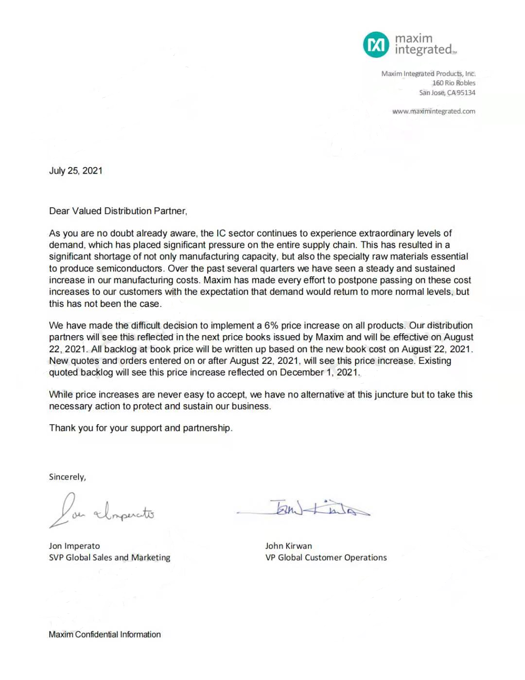 7月25日,模拟芯片大厂美信(Maxim)发函表示,受产能紧张、上游原材料成本增加等因素影响,Maxim将于8月22日正式涨价,全线涨价6%。