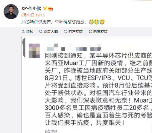 8月17日,小鹏汽车CEO何小鹏转发了一则马来西亚芯片工厂关闭的消息,并评论道——抽芯断供供更苦,举杯销愁愁更愁。可以看出,受疫情影响,缺芯断供对汽车行业是致命性的打击。