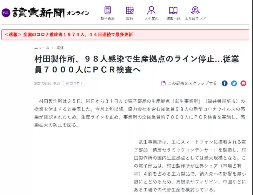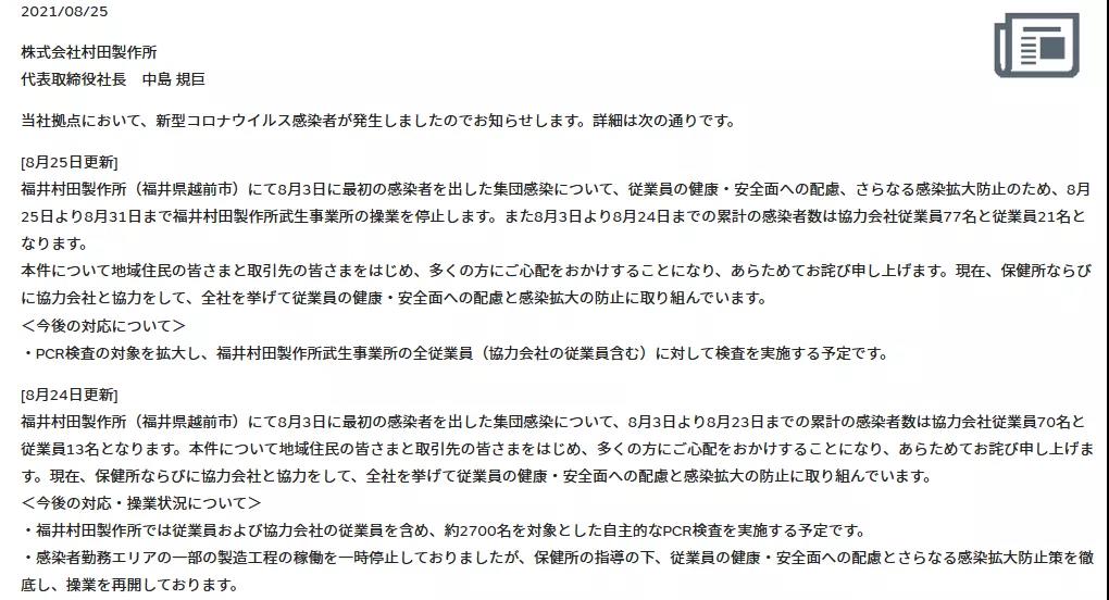 8月25日 (周三) ,在全球MLCC市场拥有40%市场占有率的日本村田制作所宣布,主要生产据点福井村田制作所的武生事业所发生新冠肺炎 (COVID-19) 群聚感染,将从当天全面停工至31日,为期一周。