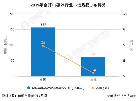 根据前瞻产业研究所的数据显示,2019年全球电容器市场规模达220亿美元,根据中国电子元件行业协会公布的数据显示,2019年我国电容器行业的市场规模为1102亿元,占全球份额比重达71%,中国已经成为全球最大的电容器市场。